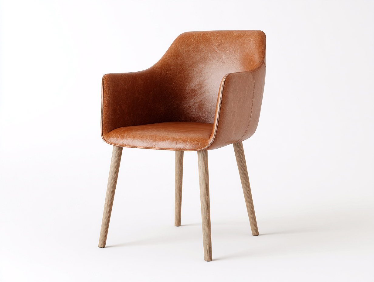 El asiento está tapizado en cuero sintético de color marrón claro con textura visual suave. Las patas de madera con acabado natural proporcionan una base firme y estable, asegurando una larga durabilidad.